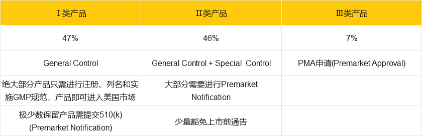 | 绝大部分产品只需进行注册、列名和实施GMP规范,产品即可进入美国市场 | 大部分需要进行Premarket Notification | |